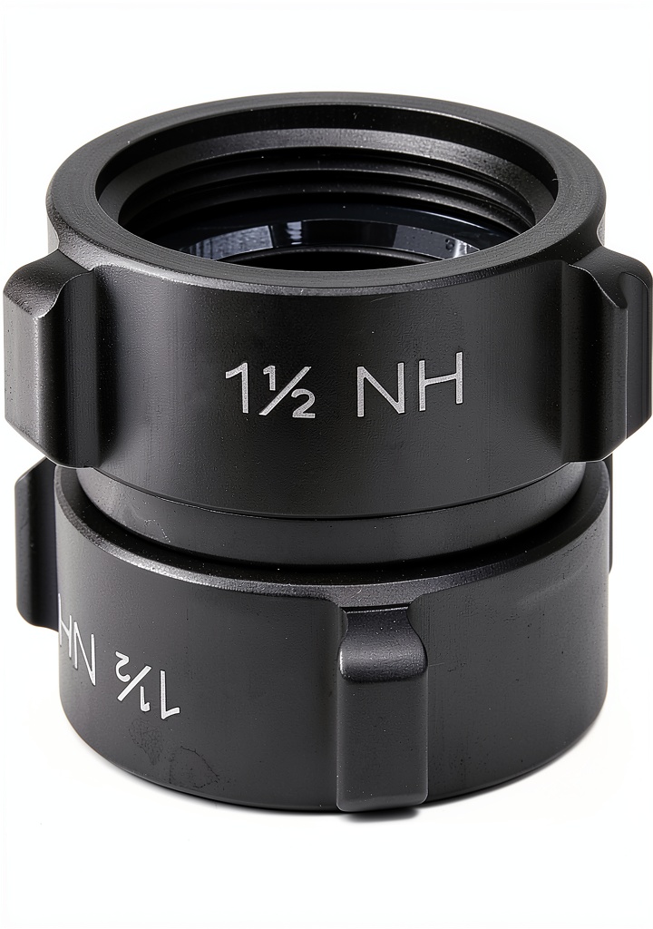 The adapter features female 1.5-inch NH/NST threads on both sides, designed to connect with standard fire hose fittings for secure, leak-resistant joints.